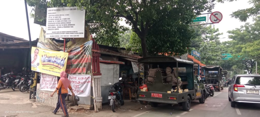 Nampak terlihat Dialog dilapangan, Jum’at (22/12/23) sejumlah personil TNI-POLRI, Satpol PP, dan pihak Security UIII berjaga di sekitar Pasar Kambing, Juanda Depok yaitu yang dikenal Kampung Bulak Kota Depok.