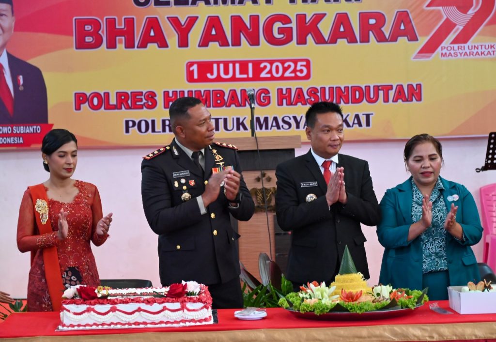 “Kami sangat menghargai peran penting yang telah dilaksanakan Polri dalam menjaga stabilitas dan keamanan khususnya di wilayah hukum Kabupaten Humbang Hasundutan. Momentum ini dapat menjadi motivasi bagi seluruh anggota Polri untuk terus meningkatkan kinerja dan profesionalisme dalam menjalankan tugas. Harapan kita bersama, kedepan kemitraan dan kerjasama yang telah terjalin baik antara pemerintah daerah dan Polri tetap terpelihara dengan baik, sehingga menciptakan masyarakat yang lebih aman, nyaman dan sejahtera” harap Dr Oloan P Nababan.