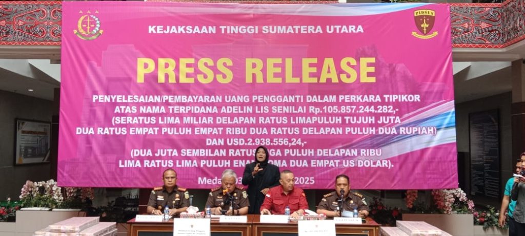 Medan, hariandialog.co.id.- Rabu 03 September 2025, sebagai upaya dalam rangka memulihkan keuangan negara dari penanganan tindak pidana, Kejaksaan melalui Jaksa Eksekutor melaksanakan eksekusi terhadap uang pengganti atas kerugian keuangan negara yang dilakukan terpidana Adelin Lis dan berhasil menyetorkan ke kas negara sebesar sebesar Rp105.857.244.282,4 (seratus lima miliar delapan ratus limapuluh tujuh juta dua ratus empat puluh empat rupiah) dan uang dalam mata uang asing sebesar US$ 2.938.556,4. (dua juta Sembilan ratus tigapuluh delapan ribu lima ratus limapuluh enam dolar amerika) yang dilakukan keluarga terpidana kepada Jaksa yang dilaksanakan di kantor Kejaksaan Tinggi Sumatera Utara