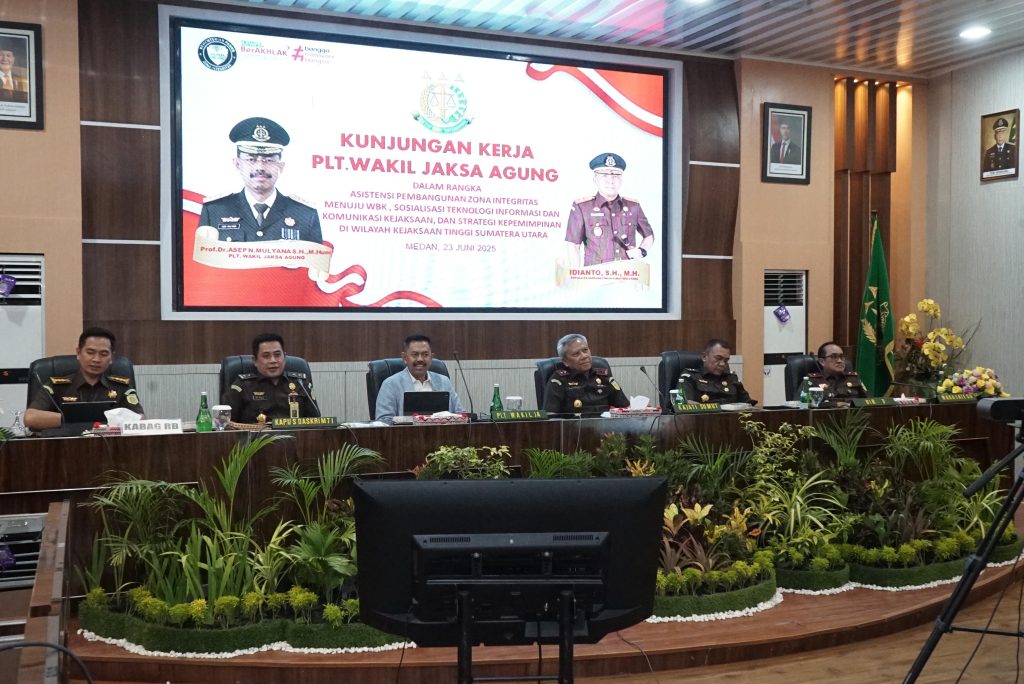 MEDAN, hariandialog.co.id.- Pelaksana Tugas (Plt) Wakil Jaksa Agung yang juga Jaksa Agung Muda Pidana Umum Kejaksaan Agung RI Prof. Asep Nana Mulyana, didampingi Direktur D Agus Sahat Sampe Tua Lumbangaol, SH,MH serta rombongan kunjungan kerja ke Kejaksaan Tinggi Sumatera Utara, Senin (23/6/2025).