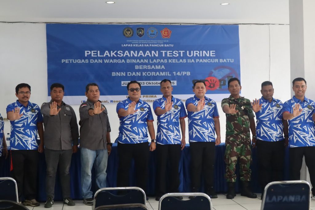 Pancur Batu – hariandialog.co.id Lembaga Pemasyarakatan (Lapas) Kelas IIA Pancur Batu bekerja sama dengan BNN Kabupaten Deli Serdang dan Koramil 14 Pancur Batu melaksanakan kegiatan tes urine bagi petugas dan warga binaan, Jumat 03 Oktober 2025