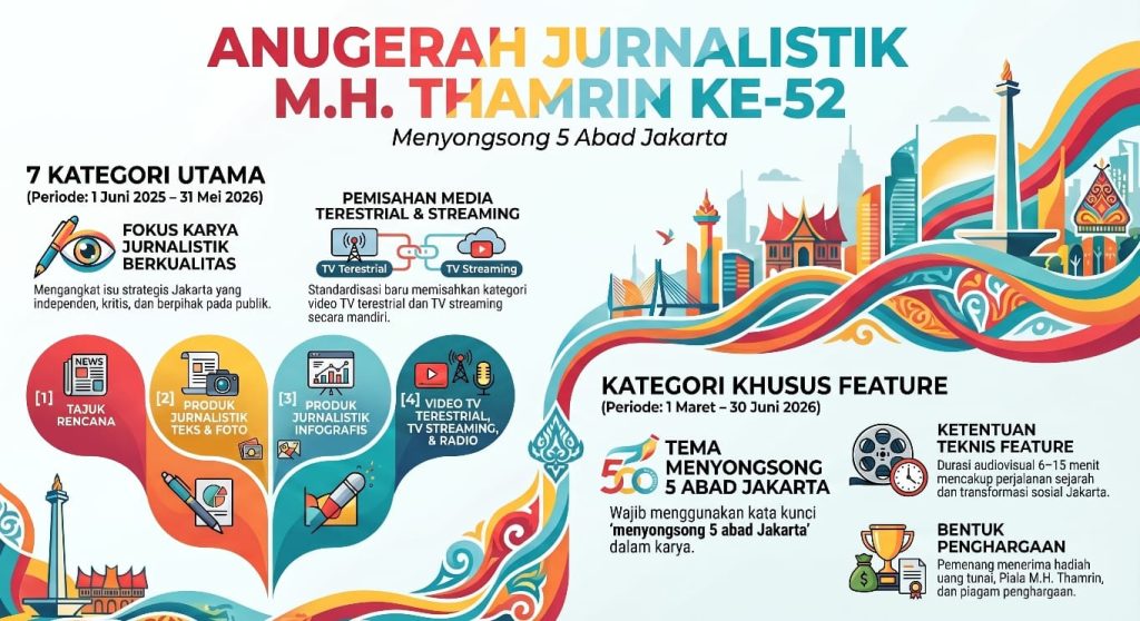 Ia menambahkan, kategori khusus ini menjadi ruang strategis bagi jurnalis untuk menggali berbagai dimensi Jakarta, mulai dari sejarah, transformasi sosial, isu lingkungan, hingga tantangan kebijakan publik dan identitas kota.