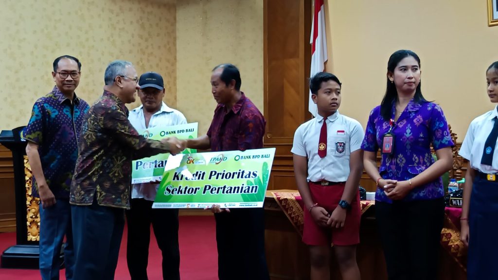 Saat cara secara simbolis diserahkan KUR kepada petani padi, jasa traktor, dan peternak bebek dengan total dana Rp125 juta. Serta penyerahan tabungan Simpel kepada pelajar SD dan SMP serta peresmian Agen Laku Pandai oleh PT.Bank BPD Bali.