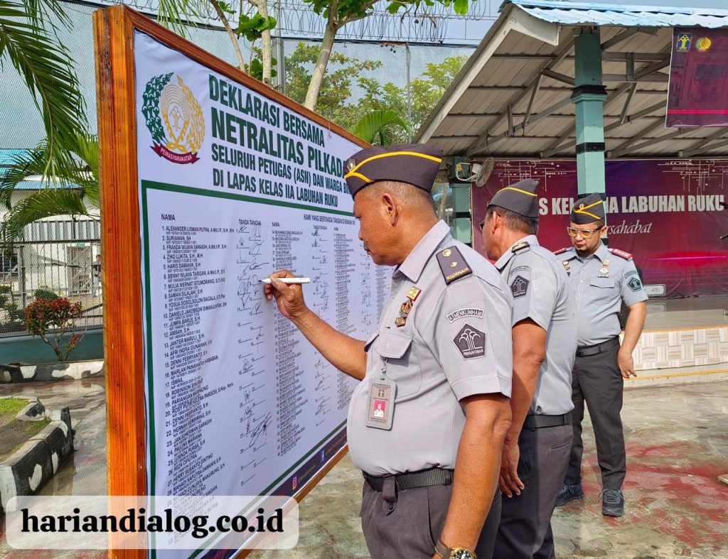 BATU BARA, hariandialog.co.id Dalam upaya mendukung terciptanya Pilkada yang damai, aman, dan demokratis, Lembaga Pemasyarakatan Kelas IIA Labuhan Ruku mendeklarasikan ikrar netralitas pada Pemilihan Kepala Daerah (Pilkada) Tahun 2024, Senin (25/11).