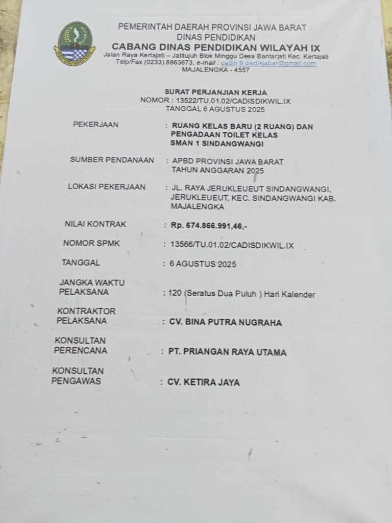 Majalengka.hariandialog.co.id- Proyek pembangunan dua ruang kelas baru (RKB) dan pengadaan toilet kelas di SMA Negeri 1 Sindangwangi, Kabupaten Majalengka, Jawa Barat, diduga bermasalah. Proyek yang menelan anggaran Rp674,8 juta dari APBD Provinsi Jawa Barat Tahun Anggaran 2025 ini disorot publik karena tidak transparan dan sarat kejanggalan.