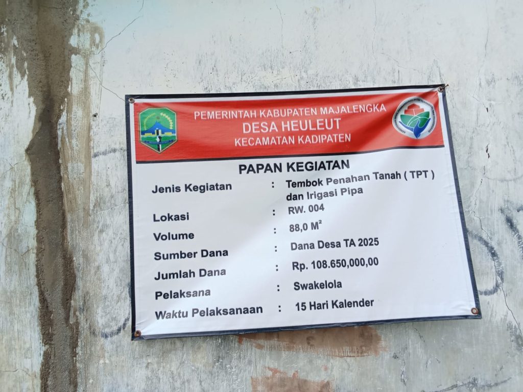 Majalengka, hariandialog.co.id-Proyek pembangunan Tembok Penahan Tebing (TPT) dan irigasi pipa yang berlokasi di RW 04, Desa Heuleut, Kecamatan Kadipaten, Kabupaten Majalengka, menuai sorotan dari sejumlah warga desa.