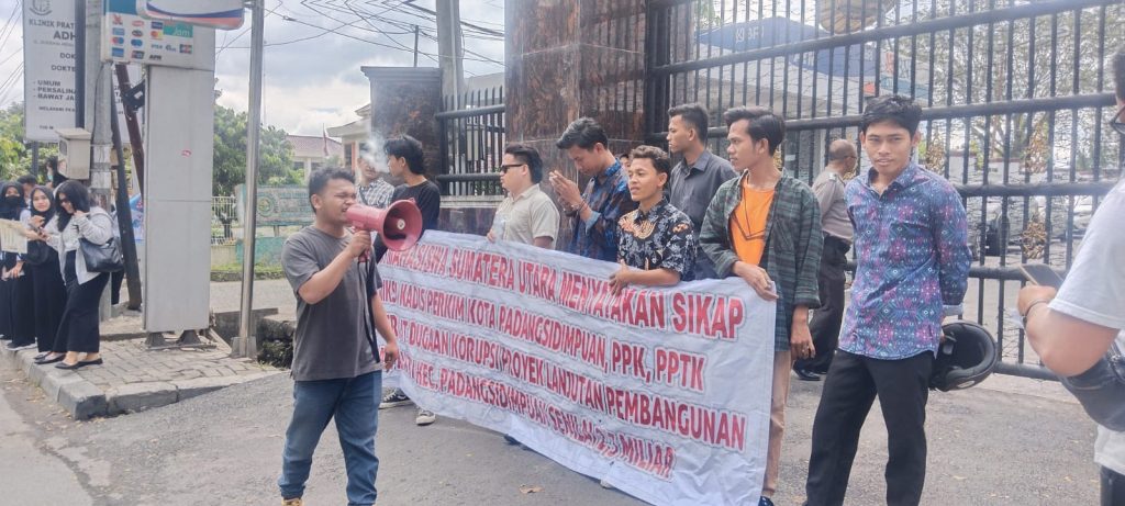 Puluhan Mahasiswa yang mengatas namakan Gerakan Aktivis Mahasiswa Sumatera Utara (GAM SU) mendatangi Kantor Kejaksaan Tinggi Sumatera Utara (KEJATISU) untuk mempertanyakan perkembangan laporan dugaan tindak pidana korupsi pada proyek Lanjutan Pembangunan Dek di Kelurahan Kantin Kecamatan Padangsidempuan utara tahun 2022 dengan total anggaran mencapai miliaran rupiah yang bersumber dari dana APBD Kota Padangsidempuan, Medan, Jln. Abdul Haris Nasution( 14/12/2023)