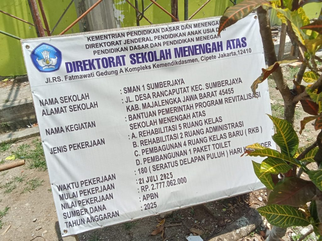 Majalengka.hariandialog.co.id- SMA Negeri 1 Sumberjaya, Kabupaten Majalengka, tengah menjalani program revitalisasi sekolah menengah atas dengan total anggaran Rp2,77 miliar dari pemerintah pusat. Proyek yang bersumber dari APBN 2025 melalui Direktorat Sekolah Menengah Atas, Kemendikbudristek ini ditargetkan rampung pada akhir Desember 2025.