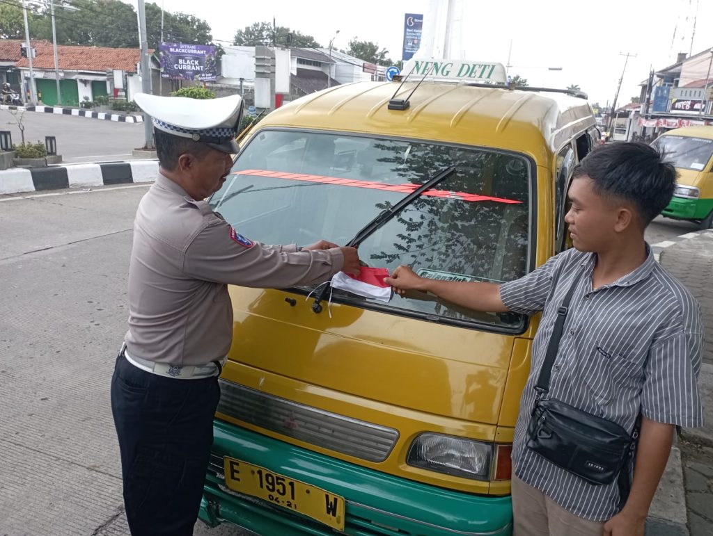 Petugas Satlantas turun langsung ke sejumlah titik strategis di wilayah hukum Polres Majalengka untuk membagikan dan memasang bendera Merah Putih pada kendaraan yang beroperasi di jalan raya.