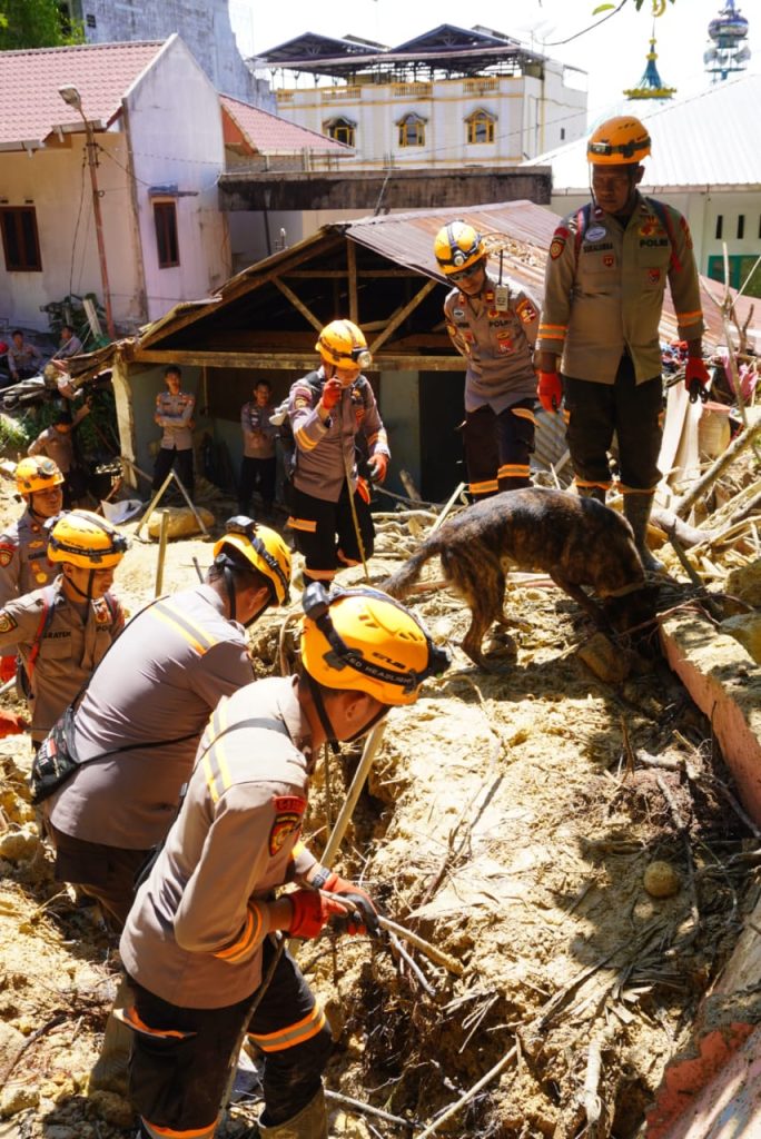 SIBOLGA, hariandialog.co.id.– Proses pencarian korban tertimbun longsor di wilayah Kota Sibolga dan Kabupaten Tapanuli Tengah terus dilakukan tanpa henti oleh tim gabungan Polri. Pada Selasa, 9 Desember 2025, Unit Polsatwa K-9 Dit Samapta Polda Sumut bersama personel BKO SAR Dit Polsatwa Baharkam Polri kembali melakukan penyisiran dan pelacakan di area terdampak.