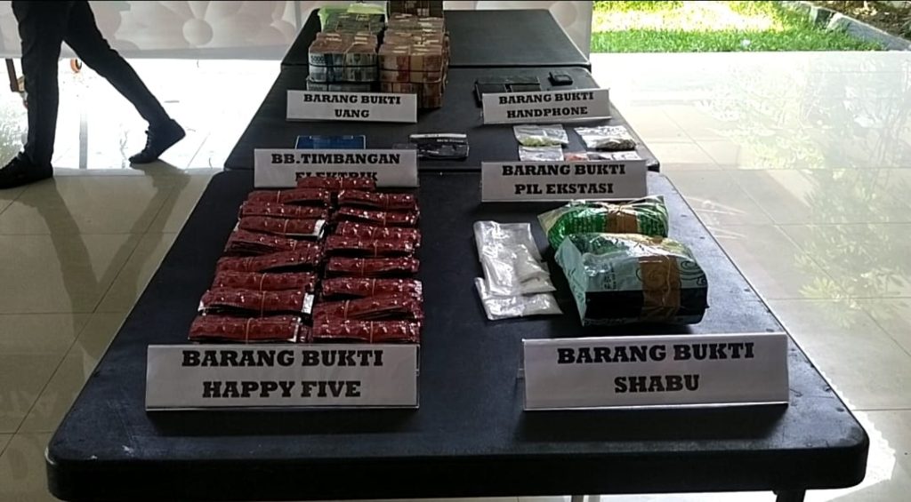 “Untuk jumlah barang bukti yang berhasil diamankan berupa Narkoba jenis SHABU 2058,62 Gram, Pil Ekstacy 220 Butir , Happy Five = 4250 Butir, dan Sp. Motor 8 Unit, Uang Rp 1.015.108.000, HP 6 Unit , Timbangan Digital 2 Unit serta Bong 3 buah” ucapnyalagi.