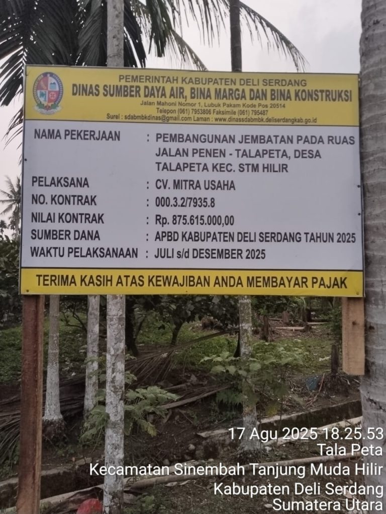 Kepala Desa Talapeta, Kabupaten Deli Serdang Manase Barus mengatakan jembatan yang berbiaya Rp 875.615.000, selesai tepat waktu. Alhasil, akses transportasi antar desa makin lancar.