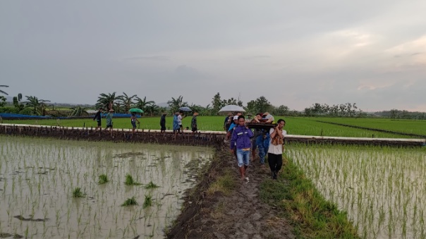 dan tiba tiba korban tersambar petir dan tergeletak di persawahan, dan saksi satu melihat