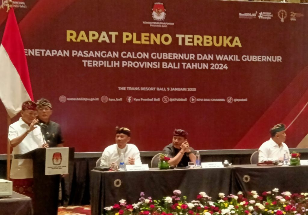 Denpasar, hariandialog.co.id– Komisi Pemlihan Umum Provinsi Bali menetapkan dan mensahkan pasangan Wayan Koster dan Nyoman Giri Prasta Sebagai Gubernur dan Wakil Gubernur Bali Priode 2025- 2030.Penetapan itu disampaikan Ketua Komisi Umum Provinsi Bali I Dewa Agung Gede Lidartawan Kamis ( 9/1-2025 ) di Kuta Badung Bali,dihadiri anggota KPU Bali serta unsur terkait.