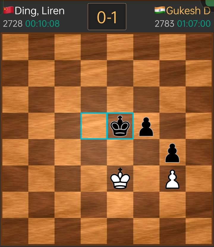 Perlawanan Ding Liren berhenti saat mengulurkan tangannya tanda takluk di langkah 58, tidak menjawab langkah Gukesh yang menempatkan Rajanya di e5. ( LIHAT DIAGRAM) Ding memilih menyerah dalam posisi permainan akhir 2 bidak melawan 1 bidak dengan posisi kalah.